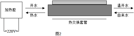 (3)傳統熱水器由于熱散失,需要不停地加熱,浪費能源,而即熱式節能飲水機可以很好的解決這個問題,圖2是即熱式節能飲水機的原理圖。燒開的水很燙不能立即飲用,即熱式節能飲水機中的熱交換套管很好地解決了這一問題,它的奧秘在于將進水管與出水管貼在一起,利用進水管中的冷水給出水管中的開水降溫,同時,進水管中的冷水被預熱后送到加熱腔中用電加熱器燒開。