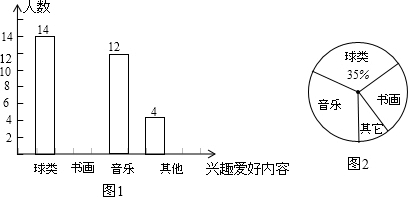 (2)在圖2中,求出“球類’’部分所對應(yīng)的圓心角的度數(shù),并分別寫出愛好“音樂”、“書畫”的人數(shù)占本班學(xué)生數(shù)的百分?jǐn)?shù).