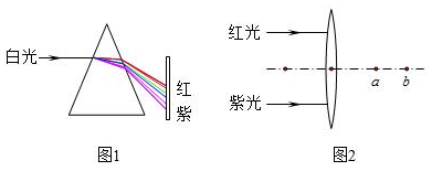 3.如圖1所示,在探究光的色散現(xiàn)象時(shí),看到白光經(jīng)三棱鏡后,光屏自上而下出現(xiàn)了紅、橙、黃、綠、藍(lán)、靛、紫的色帶。受此啟發(fā),在測(cè)量凸透鏡的焦距時(shí),如果分別用紅光和紫光平行于同一個(gè)凸透鏡的主光軸射入,得到a,b兩個(gè)焦點(diǎn),如圖2,請(qǐng)?jiān)趫D中畫(huà)出兩束光的折射光線。