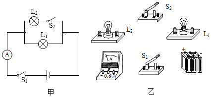 3.同學們用電流表測量并聯電路中的電流,已知通過燈L1和L2的電流都不超過0.3A,請你依據圖甲所示電路圖連接圖乙所示實物電路圖(導線不能交叉)。