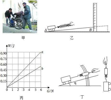 (2)在小車上逐漸添加重物,測出小車的總重G,測出沿斜面勻速拉動小車需要的力,計算出拉小車從A點到B點所做的功W1;計算出豎直向上將小車(包含重物)從水平地面提升到B點所做的功W2。以功為縱坐標,以小車總重為橫坐標,建立平面直角坐標系,作出W1和W2與小車總重G的關系圖像,分別如圖丙中的線段a和b;