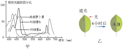 (2)甲圖中,由550nm波長的光轉為670nm波長的光后,短時間內葉綠體中C3的量會(填“增加”或“減少”)。進入秋季,葉片變黃,與植物對(填“420~470”或“620~680”)nm波長的光的利用量減少有關。